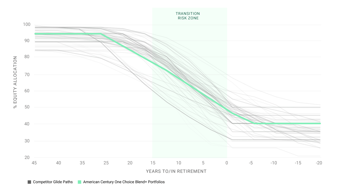 As participants reach the transition phase toward retirement, glide path design involves more than just the level of equity allocation — seeking to manage against large losses is important too. We know that a shock — an unexpected job loss or significant market event — could jeopardize savings plans just when participants have the most to lose and the least amount of time to recover.