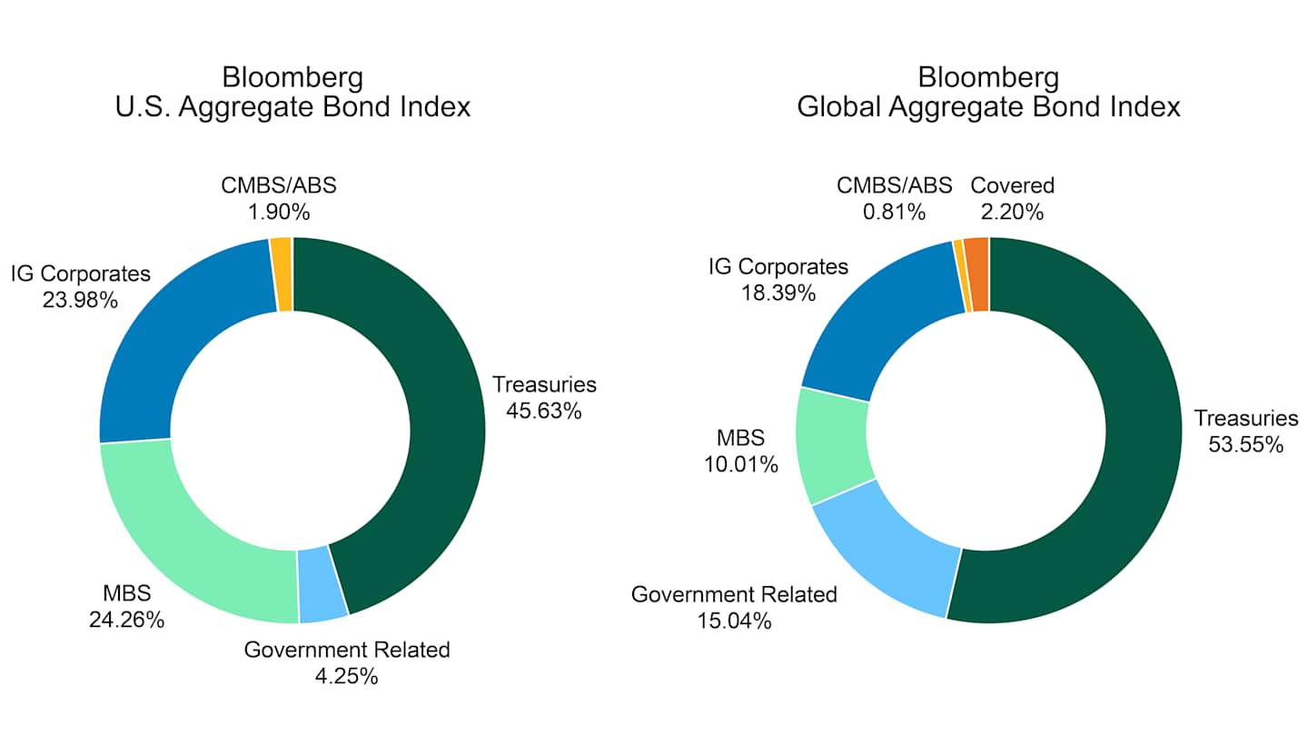 Limited investment universe. Broad bond indices—and the portfolios that track them—provide exposure to longer-maturity, high-quality government, government-related and corporate bonds, as Figure 1 illustrates. Conversely, investors in actively managed portfolios may pursue more opportunities from the other sectors in the index as well as from non-index sectors, such as asset-backed, securitized, non-U.S. and high-yield securities.