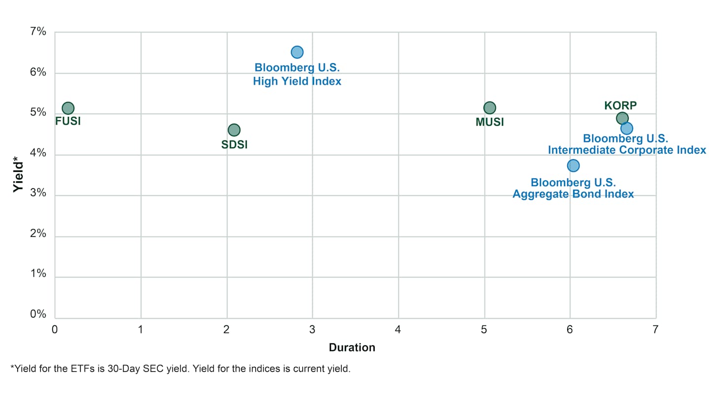 Figure 2 compares each ETF's yield and duration to the broad U.S. bond market, highlighting the range of options for both income potential and interest rate risk.